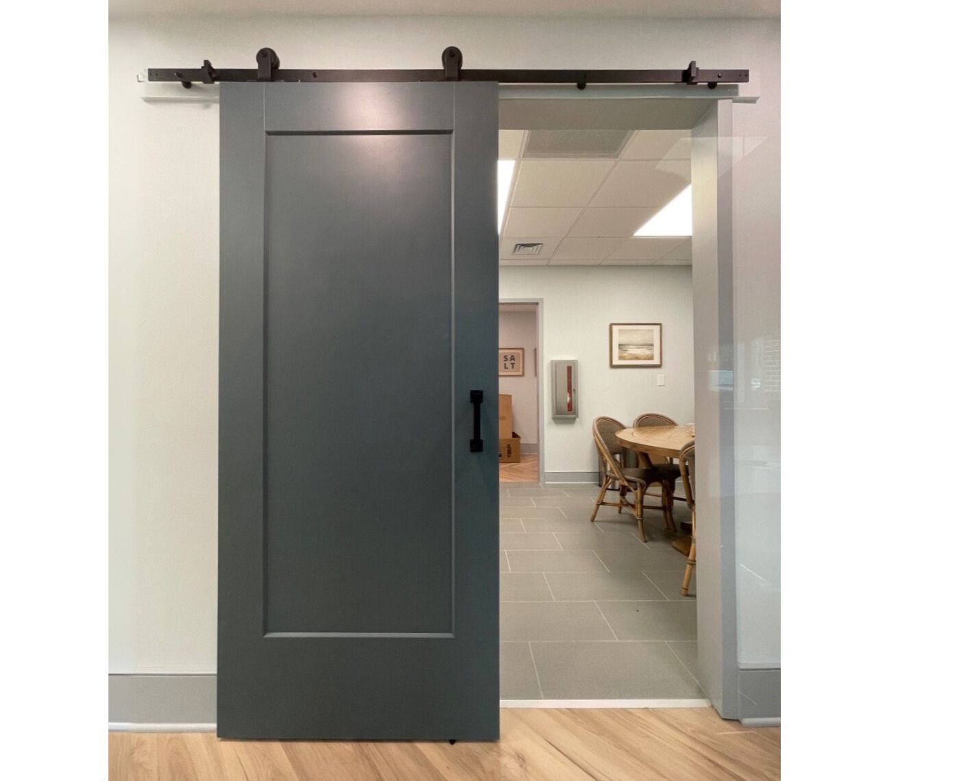 This office renovation stands out thanks to the exceptional design and finish selections by Poppy and Shae Designs. The project scope included selective demolition, the installation of new partitions, the creation of stylish half-walls, and acoustical ceiling modifications. A barn door was added to the break room. A storefront glass system was added to the conference room, creating an open, modern look. Additional updates included new casework, countertops, custom millwork, and wood paneling. The project also featured the installation of durable LVT flooring in a herringbone pattern, fresh paint, and modifications to mechanical, plumbing, and electrical systems.